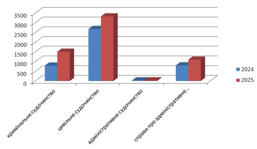 Таким чином, порівнявши показники даного звітного періоду за 2025 рік з показниками 2024 року (Діаграма 2) слід відмітити, що в 2025 році збільшилося надходження справ: