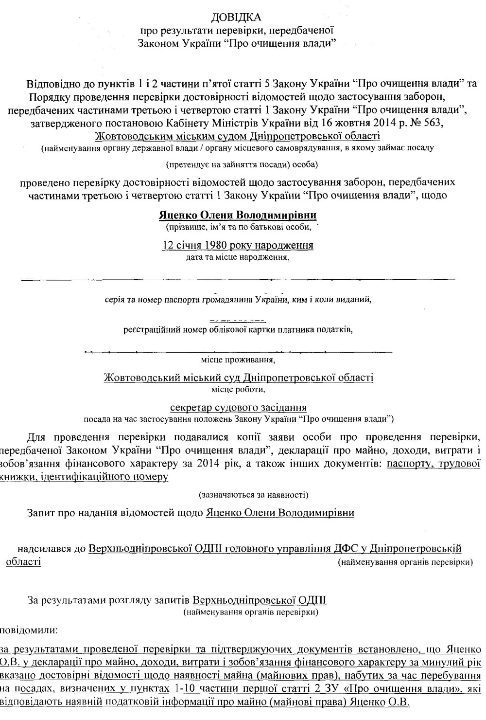 Інформація щодо результатів перевірки передбаченої Законом України "Про очищення влади"